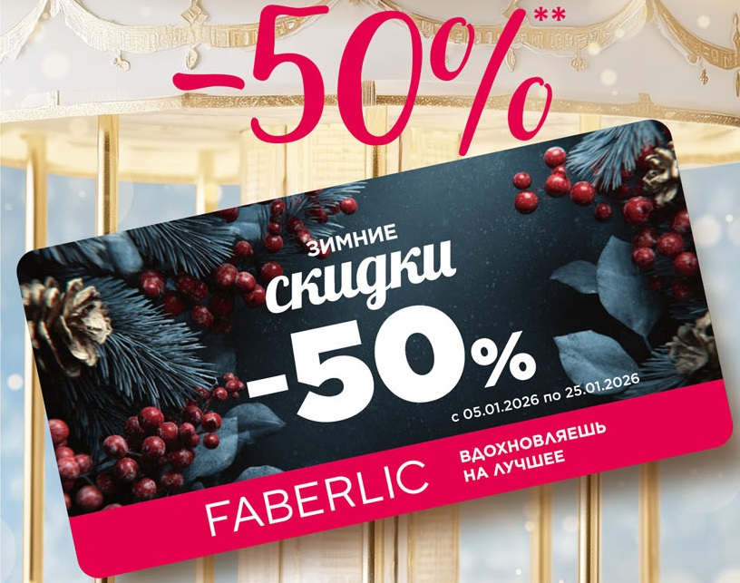 Заказывайте и оплачивайте товар по каталогу 18/2025 и 19/2025 (с 24.11.25 по 04.01.26 г.) и на каждые 999 руб. покупки получите 50% скидку* на продукцию из категории Уход за кожей, Уход за волосами, Гигиена, Парфюмерия, Декоративная косметика, Ароматерапия, Косметика для дома, Товары для здоровья в каталоге 01/2026 с 05.01.26 по 25.01.26